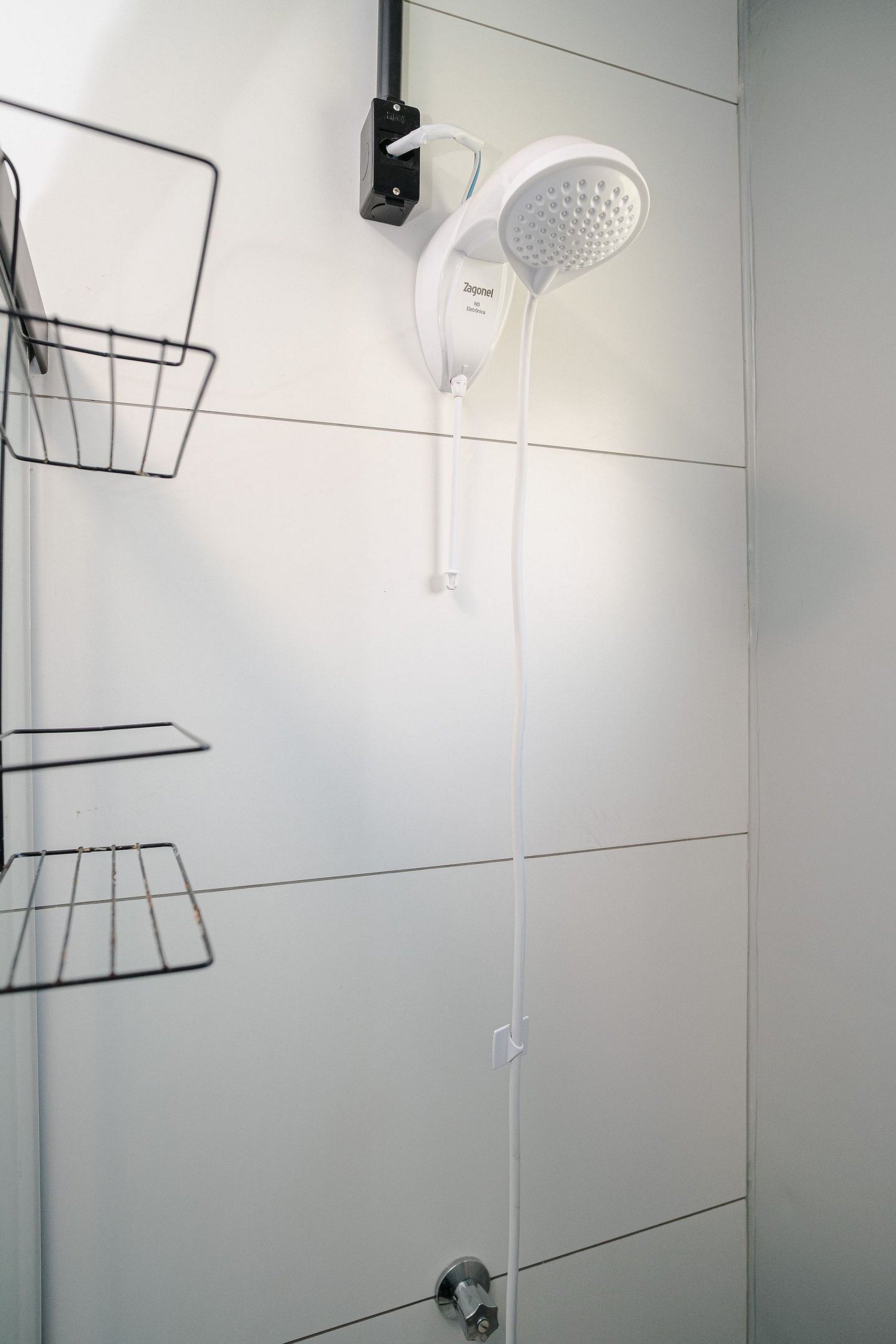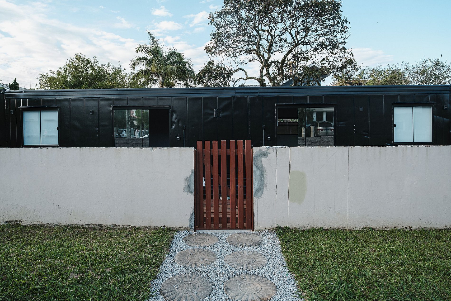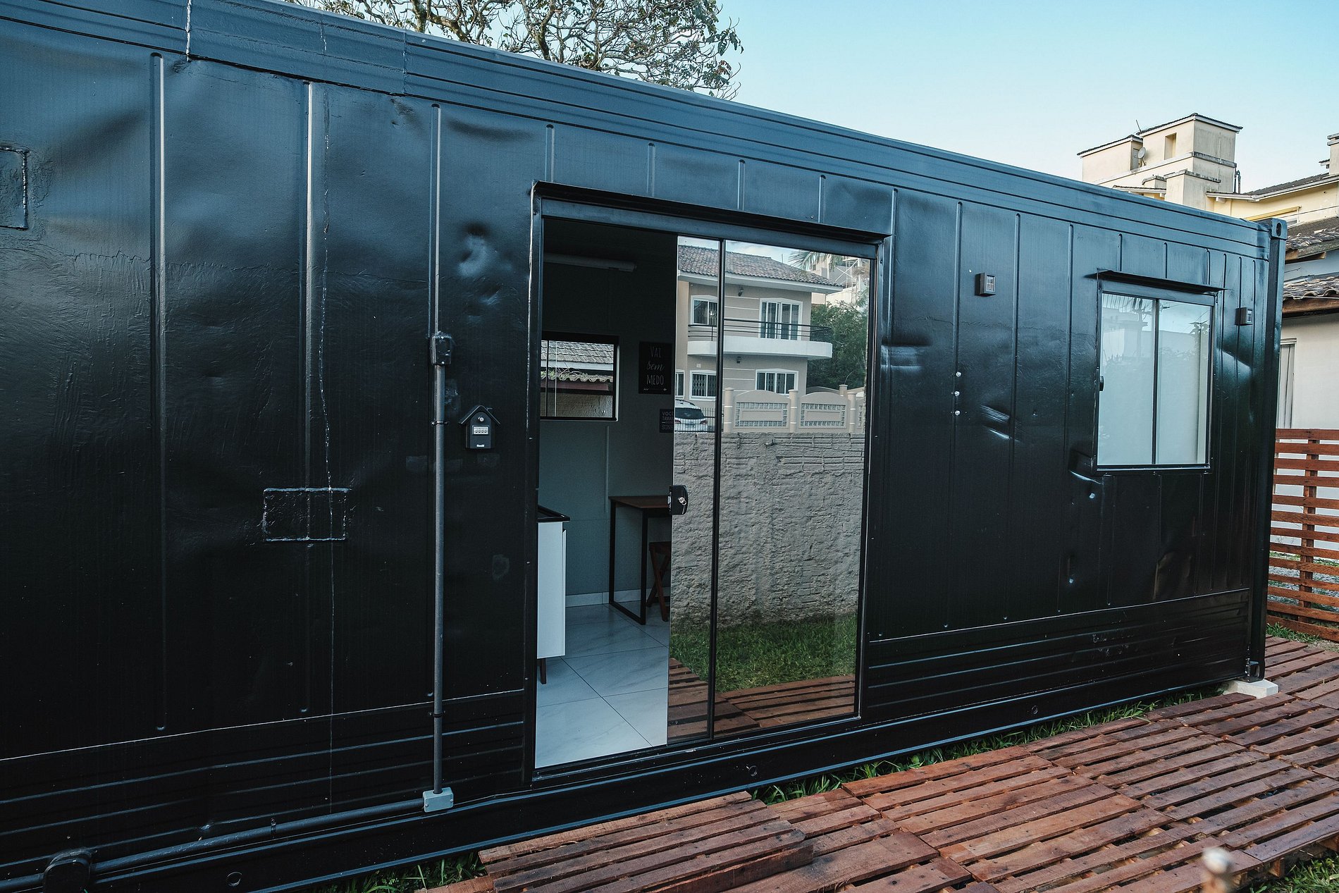 O container faz parte de um terreno com outras acomodações — uma casa e uma kitnet — porém cada unidade é totalmente independente, com entradas separadas e privacidade garantida. Apenas os dois containers compartilham um espaço na frente: um charmoso deck com um banquinho sob a sombra, perfeito para relaxar, tomar um café ou aproveitar a brisa leve de Jurerê.