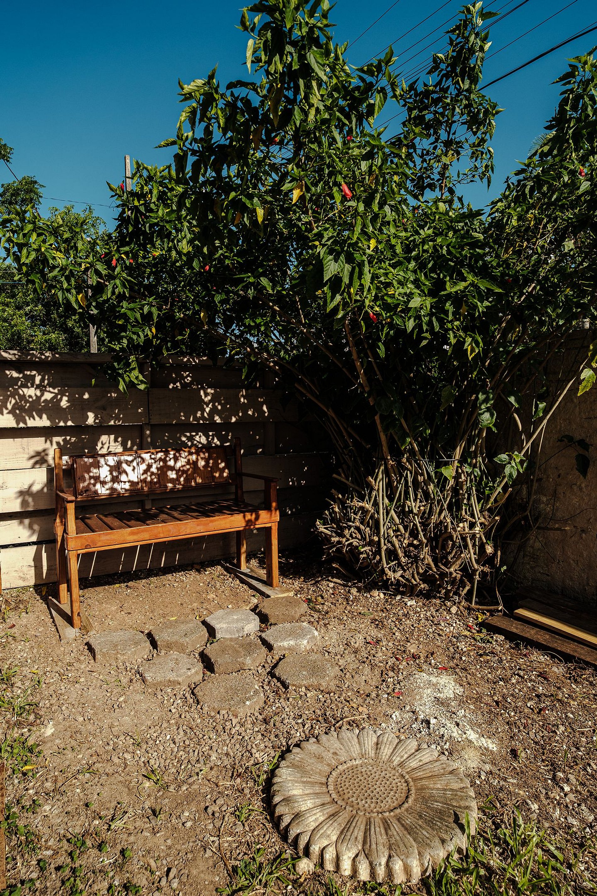O quintal é um charme à parte: área verde, deck e banco sob a sombra, trazendo aquele clima de refúgio simples e acolhedor — perfeito para começar o dia ou relaxar ao final da tarde.