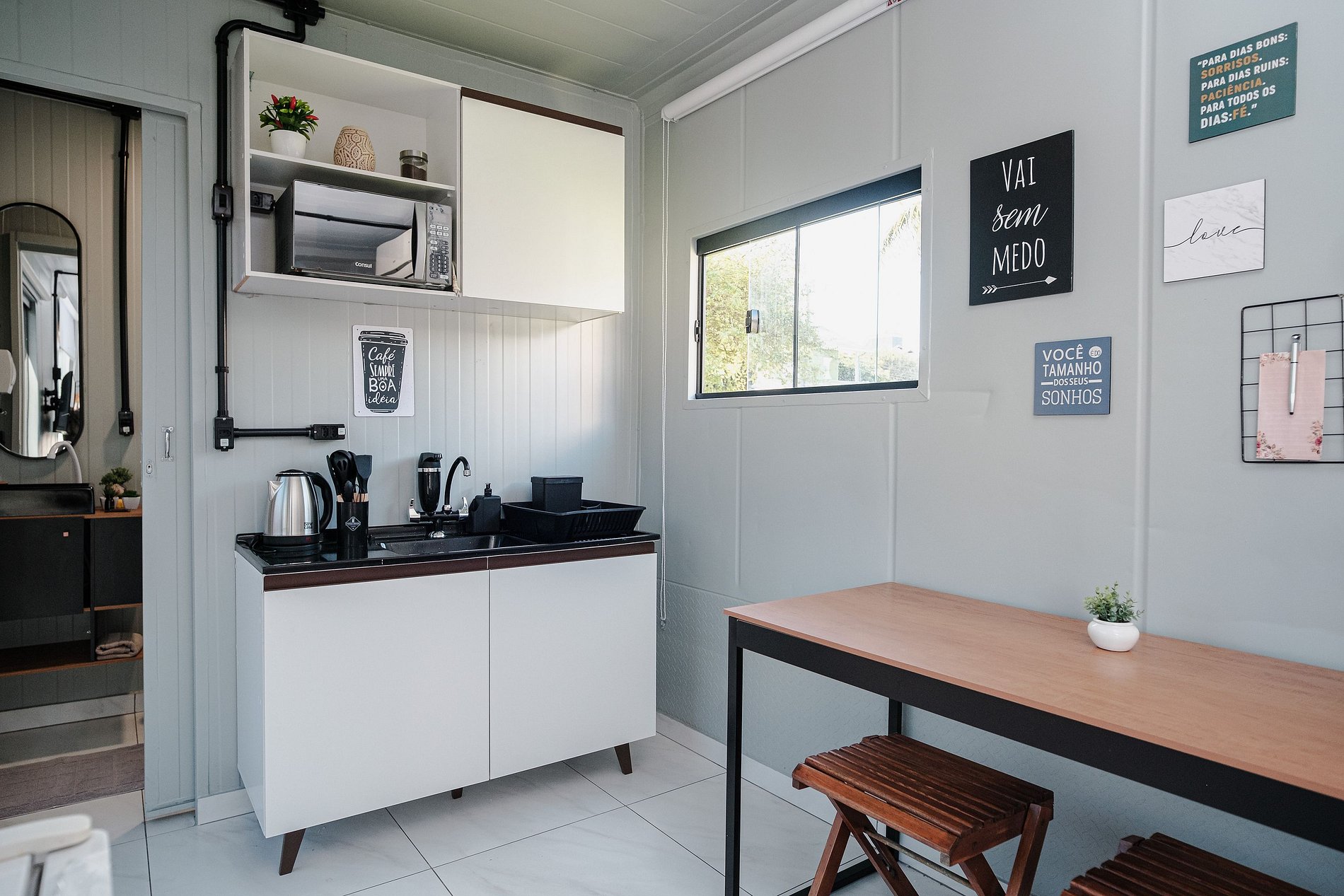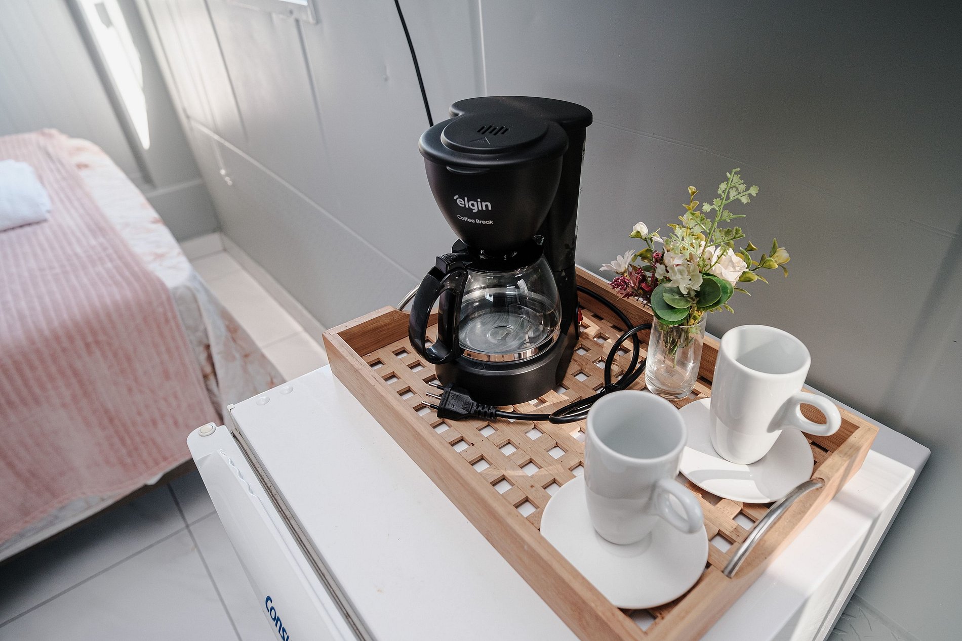 O interior conta com cama de casal confortável, ar-condicionado para garantir frescor mesmo nos dias mais quentes, e banheiro privativo. A cozinha compacta e totalmente equipada oferece micro-ondas, cafeteira, jarra elétrica, liquidificador, pia e frigobar — tudo que você precisa para preparar seu café da manhã ou um lanche leve com conforto. Há ainda uma mesa com duas cadeiras (ideal para refeição ou trabalho leve), armário aberto + cabideiro para estender ou pendurar roupas, e espaço dedicado para acomodar suas roupas e pertences com praticidade.