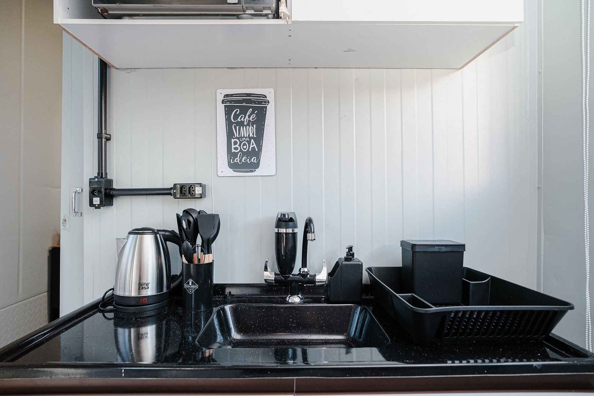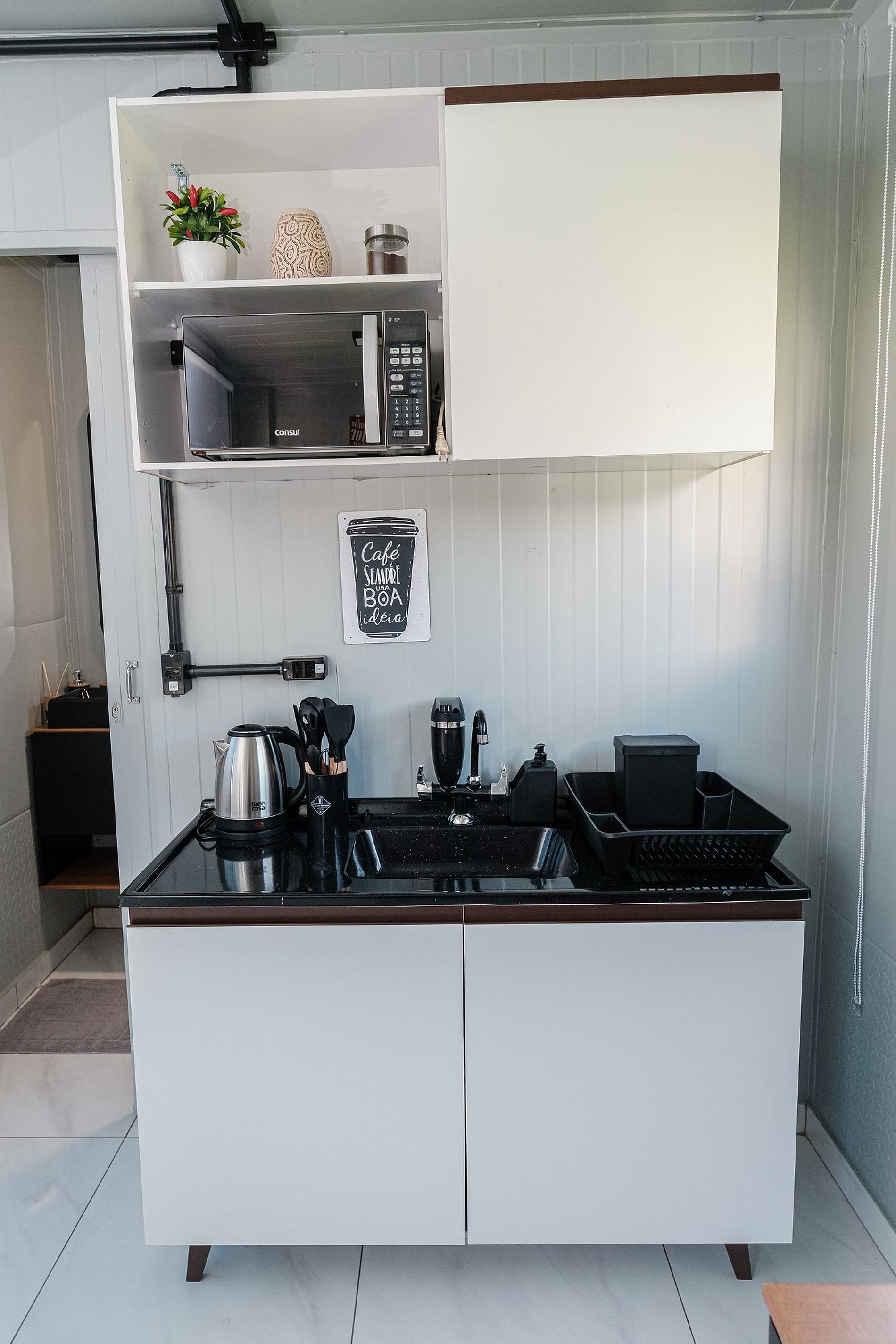 Cozinha compacta completa com micro-ondas, cafeteira, jarra elétrica, liquidificador, pia e frigobar